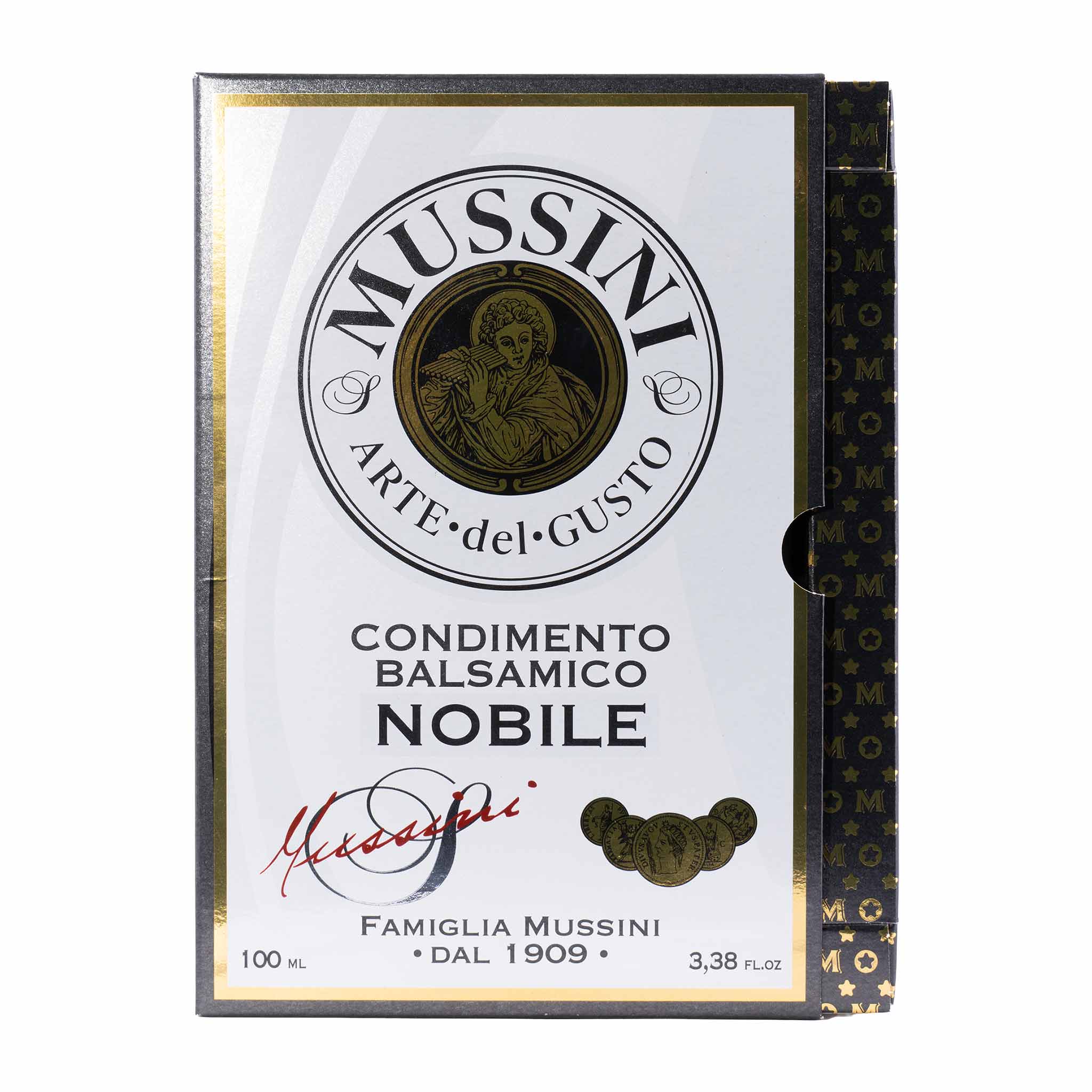 Der Mussini Condimento Balsamico Nobile ist Teil der „Riserva Nobile“ Reihe von Mussini und wird gemäß der traditionellen Familienkunst gefertigt. Aus reinem, gekochtem Most entstehen langsam ausgewählte Komponenten, die in Fässern aus edlem Holz reifen und dadurch intensive Aromen entwickeln. Es werden keinerlei Zusatzstoffe wie Caramel oder künstliche Zusätze verwendet – das Produkt ist glutenfrei und eignet sich für vegetarische und vegane Ernährung.
