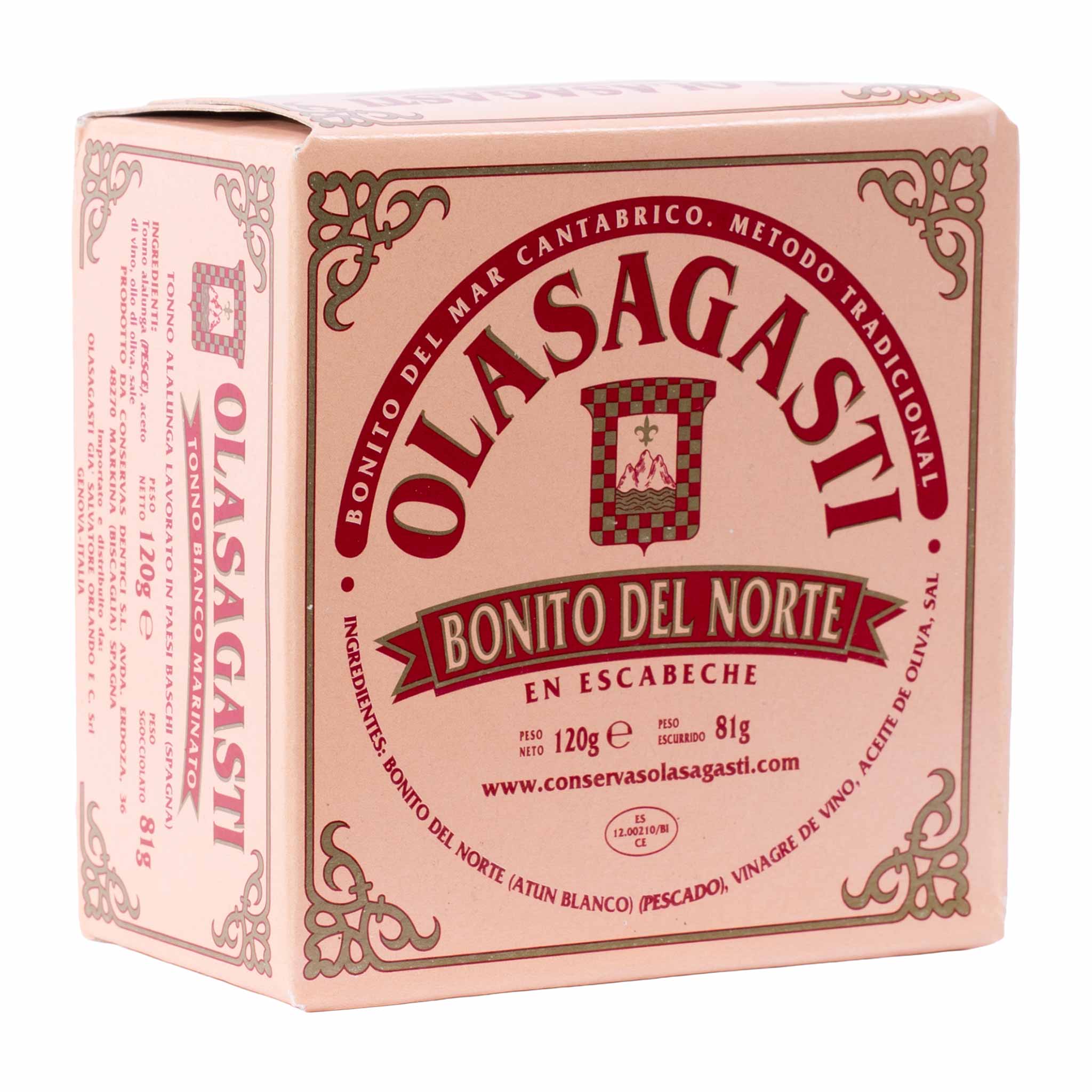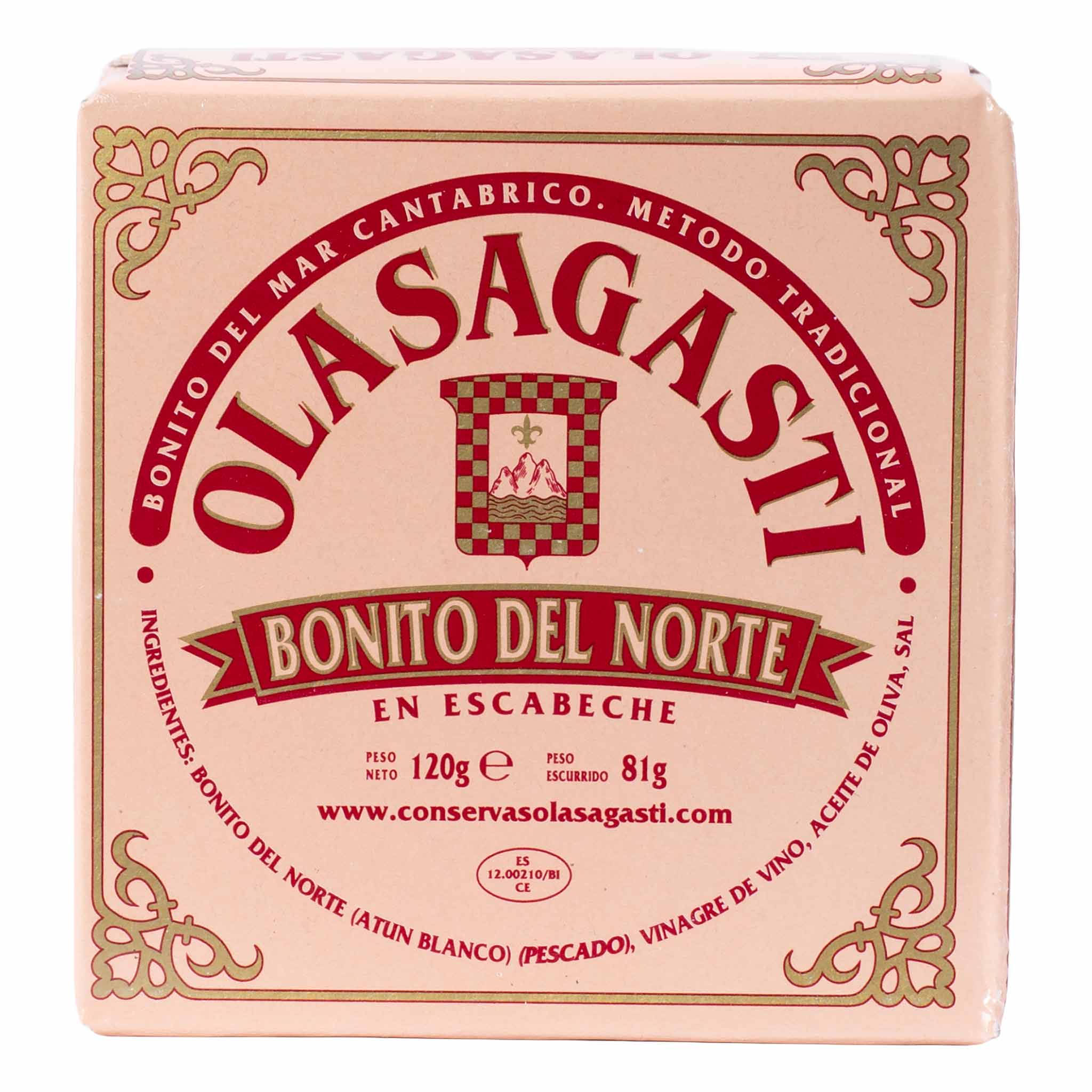 Der in Escabeche Marinade eingelegte weiße Thunfisch von Olasagasti, der Bonito del Norte, ist eine wahre Delikatesse. Aromatische, saftige, zarte Filets vom Langflossen Thunfisch werden direkt nach dem delfinschonenden Fang, der nur in der Zeit zwischen Juni bis November stattfindet, frisch und traditionell verarbeitet, das bedeutet sie werden von Hand geschnitten und schonend gegart. Später werden die kompakten Stücke von Hand eindosiert und mit würziger Marinade aufgegossen. Olasagasti ist bekannt für beste Fischkonserven aus Spanien. Der weiße Thunfisch reift in der Escabeche Sauce, das bewahrt seine helle Farbe und verleiht ihm seinen ausgezeichneten Geschmack. Alle Fischkonserven von Olasagsti werden ohne Zusatz- oder Konservierungsstoffe haltbar gemacht und sind farbstofffrei.