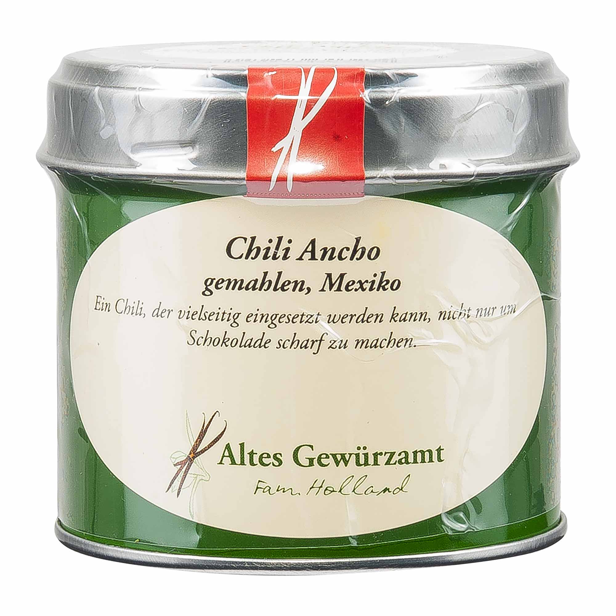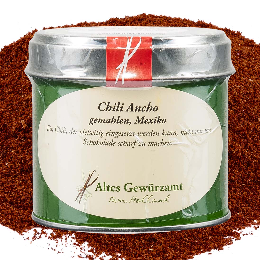 Der Altes Gewürzamt Chili Ancho ist ein mild scharfes Chilipulver (3 von 10) von Gewürzmüller Ingo Holland aus Klingenberg. Der getrocknete Poblano-Chili schmeckt fruchtig und süß mit reichen Tabak-, Pflaumen- und Rosinenaromen, etwas scharf. Ein Chili vom Altes Gewürzamt, der vielseitig eingesetzt werden kann, nicht nur um Schokolade scharf zu machen.