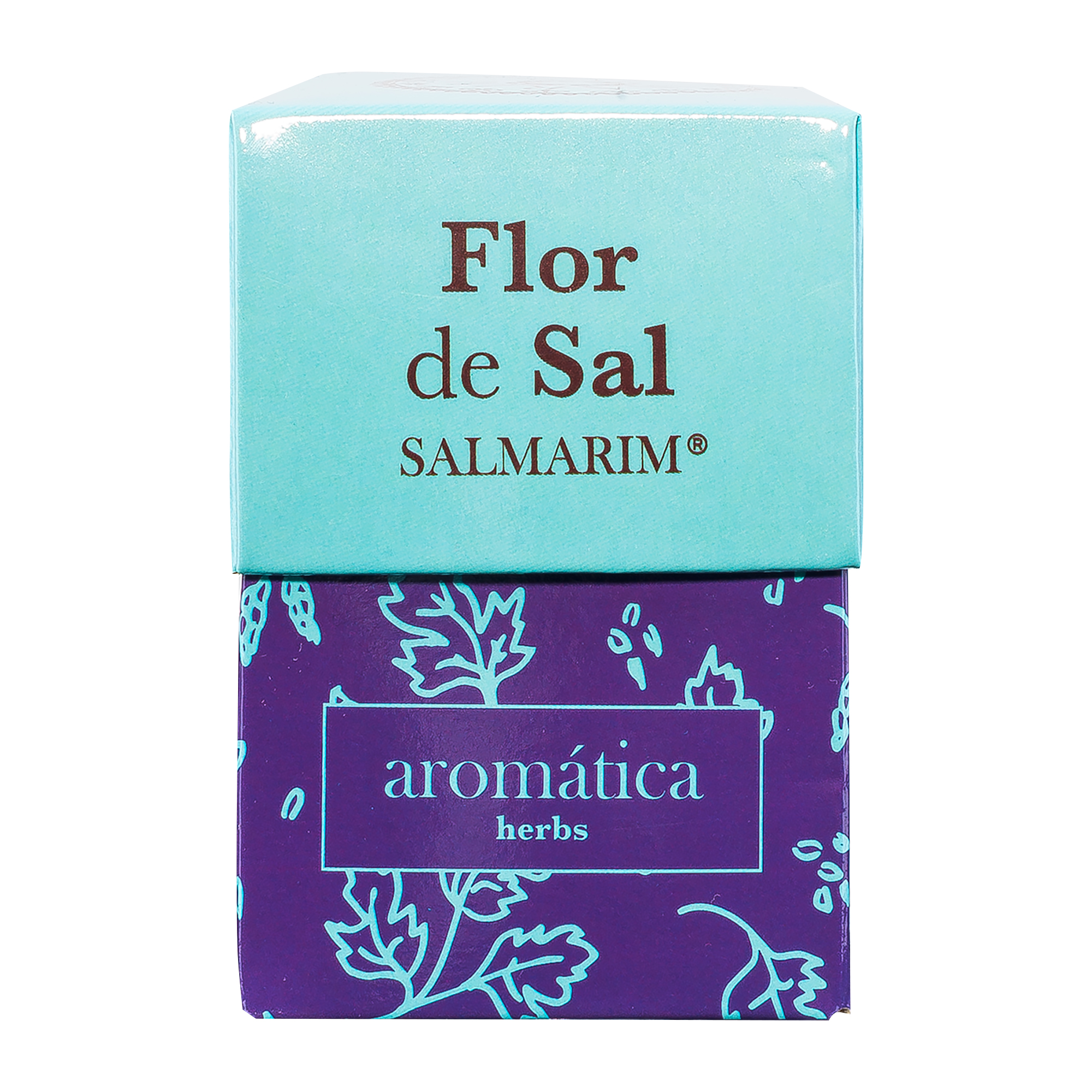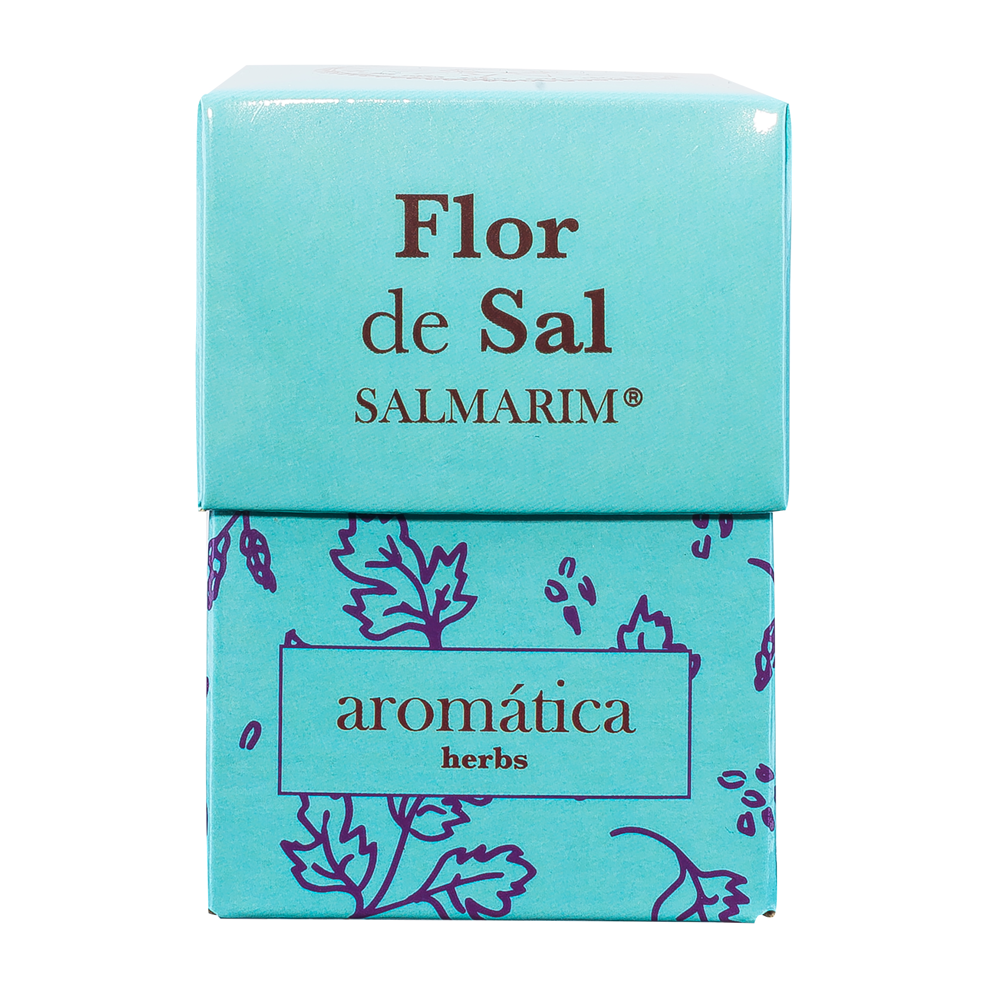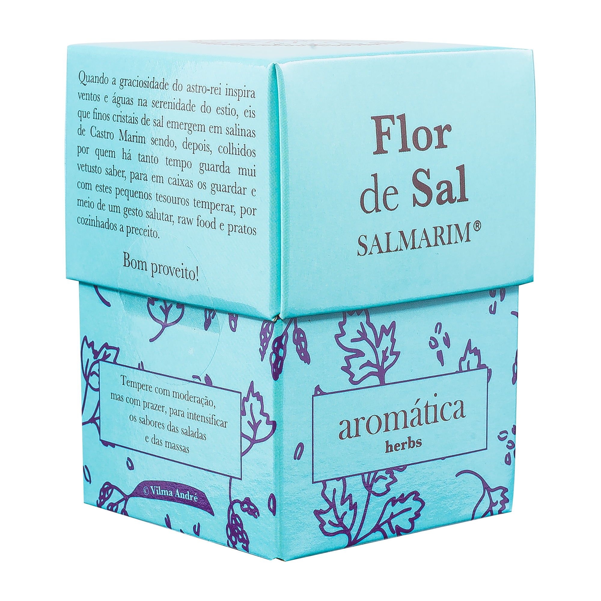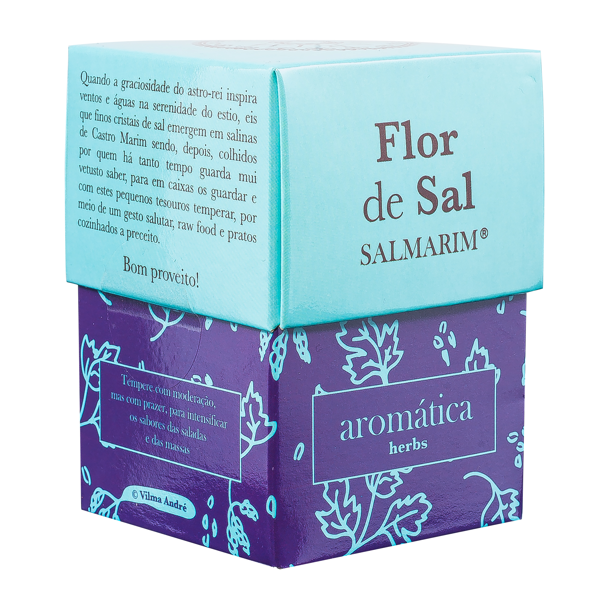 Das Salmarim Flor de Sal aromática, das ist feinstes Fleur de sel mit Kräutern aus Castro Marim an der Algarve. Das feine Salz aus Portugal enthält Oregano und Petersilie und ist ideal zum Würzen von Fisch, Gemüse oder Kartoffeln.