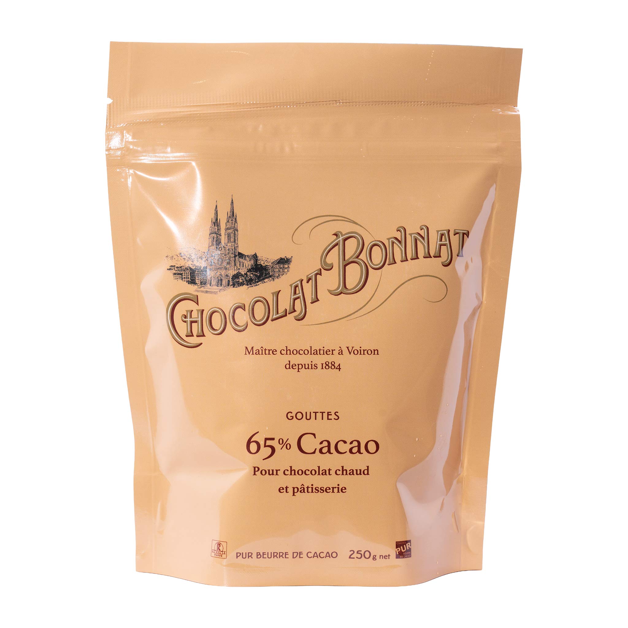 Intensiv-schokoladige Trinkschokolade von Bonnat mit 65 % Kakao. Cremig, aromatisch und im wiederverschließbaren 250-g-Beutel lange frisch.