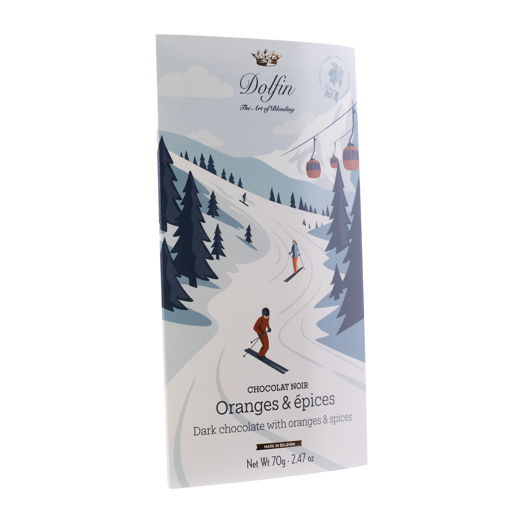 Die Dolfin dunkle Schokolade mit Orange und Gewürzen, als festliche Geschenkidee stilvoll verpackt mit Skifahrt-Motiv, entführt in winterliche Genusswelten.