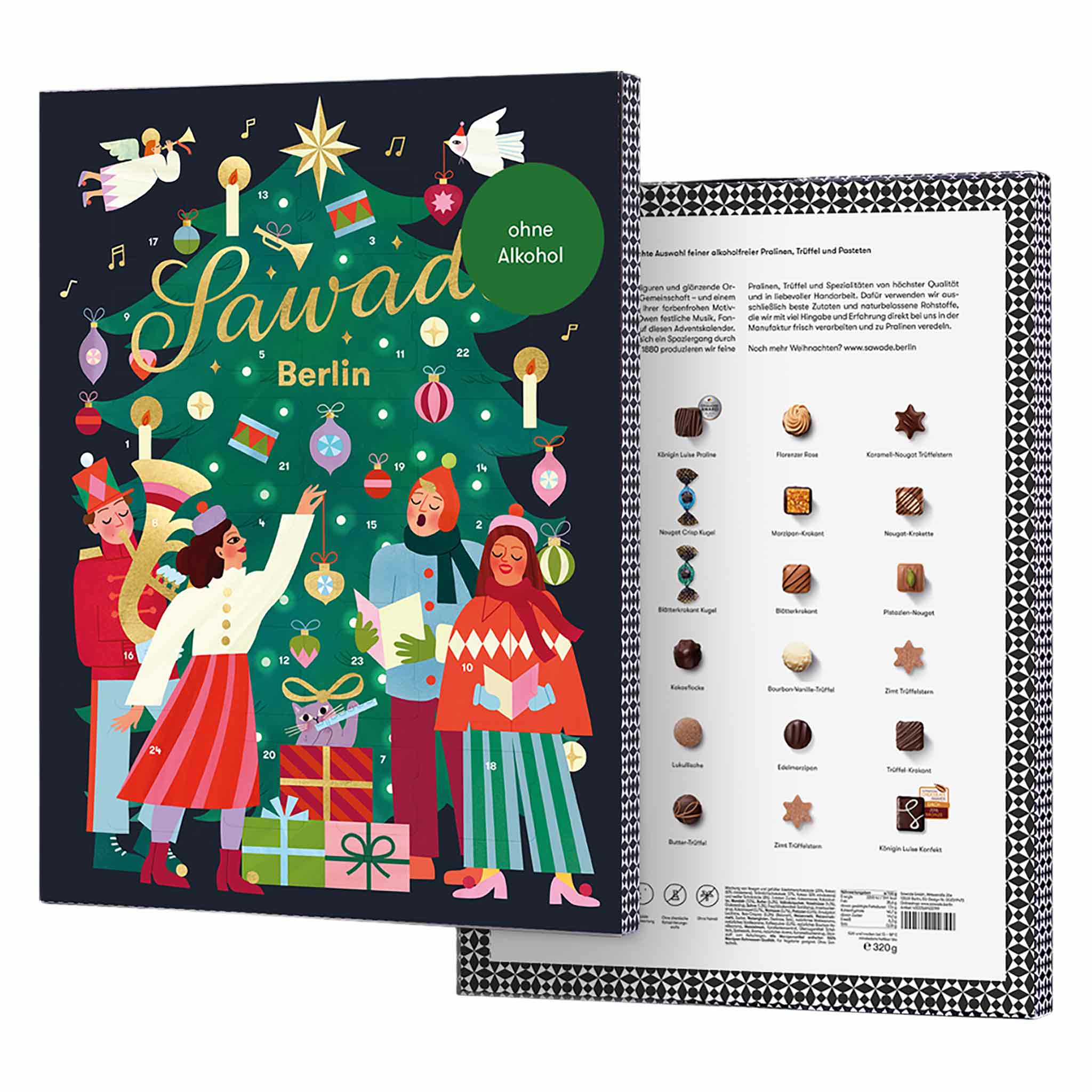 Der Sawade Adventskalender alkoholfrei mit dem Motiv »Tannenbaum« von Clare Owen enthält eine köstliche Auswahl an 24 Pralinen, Trüffeln und Spezialitäten, klassische Sawade Produkte und Weihnachtsspezialitäten. Dieser Adventskalender ist ausschließlich mit alkoholfreien Pralinen gefüllt und daher auch für die kleinsten Sawade Fans geeignet.