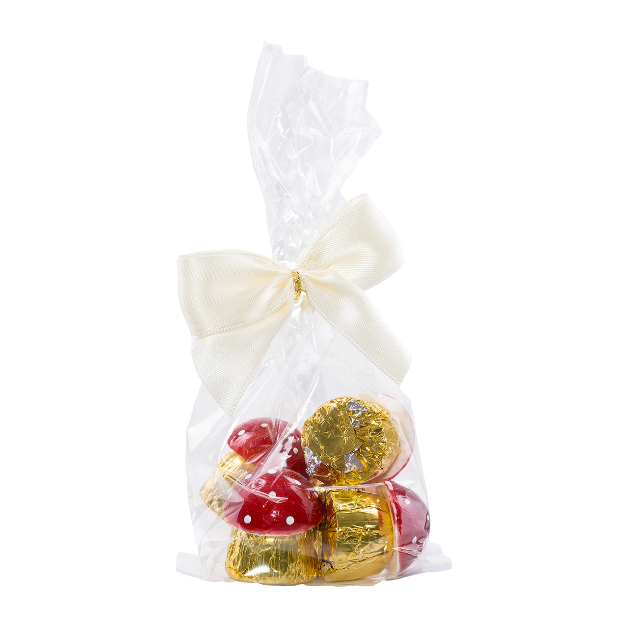 Die traditionellen Sawade Schoko-Pilze aus Vollmilchschokolade mit Nougat gefüllt erfreuen sich seit Generationen großer Beliebtheit. Die Schokolade in goldene Folie gewickelt und mit einer klassischen roten Kappe verziert, eignet sich perfekt zum Dekorieren festlicher Tafeln oder als kleine Aufmerksamkeit zum Jahreswechsel. Wir füllen 5 Stück davon für dich in einen Beutel und machen eine kleine Schleife dran, so wird daraus ein Geschenk für Dich oder Deine Liebsten.