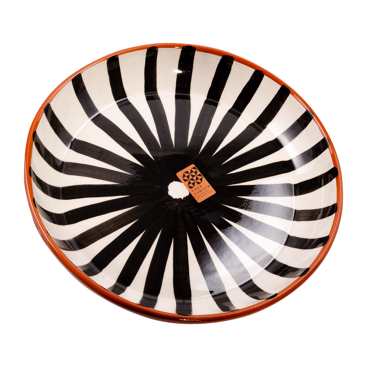 Die Casa Cubista Keramikschale groß ist eine flache Schale mit dem Muster ray black, Strahlen in Schwarz. Die schöne Terracotta Schale aus hochwertigem Steingut wird für Casa Cubista in Portugal von Hand gefertigt und lasiert. In der Large Bowl kannst Du viele Leckereien auf den Tisch bringen. Mit 26-28cm Durchmesser bietet sie Platz für allerei Hauptgänge, sie macht sich gut als Tapas- oder Vorspeisenplatte und sieht mit Obst oder Nüssen bestückt wunderbar dekorativ aus.