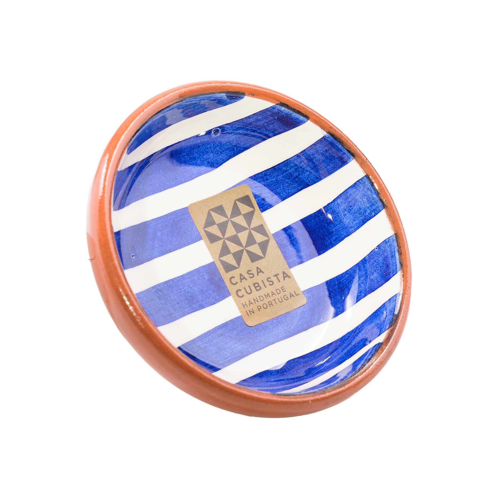 Die Casa Cubista Keramikschale klein ist eine flache Schale mit dem Muster bold stripe blue - breite blaue Streifen. Die schöne Terracotta Schale aus hochwertigem Steingut wird für Casa Cubista in Portugal von Hand gefertigt und bemalt. In der Mini Bowl kannst Du viele Kleinigkeiten auf den Tisch bringen, Oliven, Dips, Zitronenspalten, Nüsse oder Gummibärchen. Auch im Schlafzimmer, Flur oder Bad kannst Du die kleine Keramikschale nutzen, z.B. als Ablage für Kleingeld, Knöpfe oder für Schmuck.
