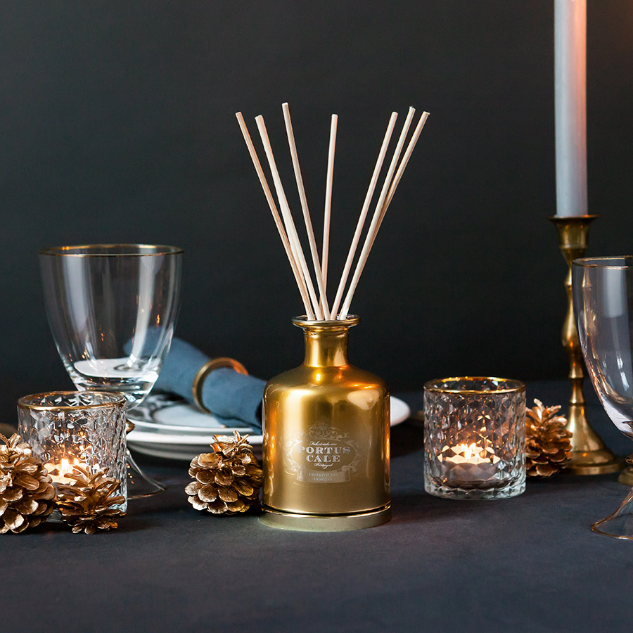 Der Raumduft Diffuser Festive Blue von Castelbel Porto aus der Serie Portus Cale duftet nach Tanne, Zeder und Rosmarin. Der wunderbar winterliche Duft verleiht ein gutes, frisches Raumgefühl und seine goldene Glasflasche versprüht noch dazu Festtagsstimmung.